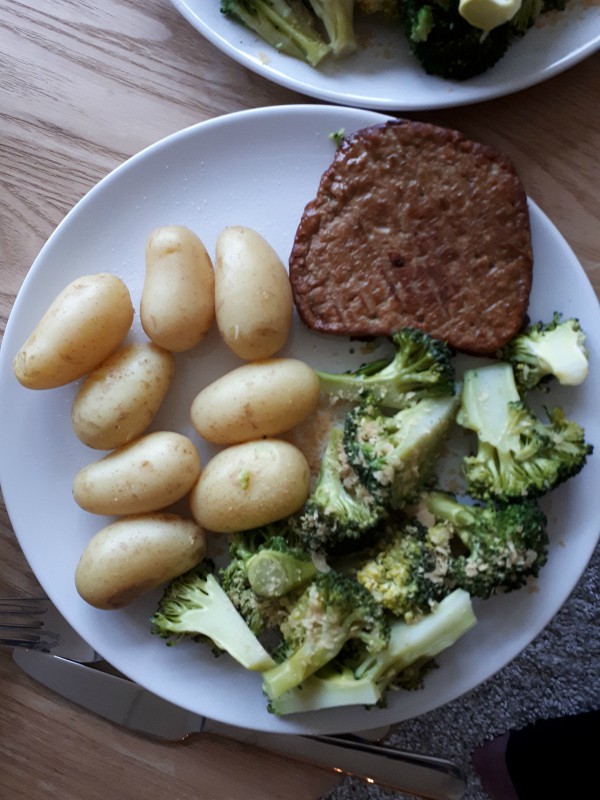 A super simple dinner. I’ve noticed I’m starting to get lazy with my cooking, now that I’m cooking almost every single night. I don’t always feel like cooking up something new and exciting, so sometimes we end up eating boiled potatoes with steamed broccoli and vegan “steak”. The steak was something we tried for the first time, and I’m happy to report it doesn’t taste anything like steak, haha! It was good though :)