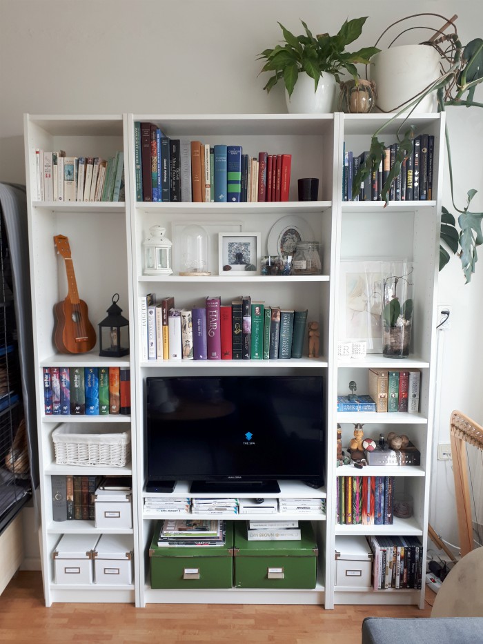 Here they are. I remember back during Vlogmas right after the move, in one of my vlogs I mentioned considering closing the bottom shelves behind a curtain or some door of sorts. We never got around to that but I was very unhappy with the way this looked. Much too colourful and overstuffed, I feel like it made the whole room look more cluttered. The top shelves weren’t as bad. I have re-done those a few times already and it gets better every time, although I still feel like they could be much nicer.