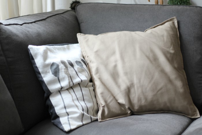 There isn’t much wrong with the way it is now, but I did feel like the cushions I had didn’t fit the new house. The cushions are some of the items I’ve had since 2011 and most of them have seen their best time. I bought them when I didn’t have a couch and needed to transform my bed into a sitting area every day, so I got lots of cushions to make that possible. It worked wonderfully and it was one of the elements of my room I loved the most, but here all the little cushions with different prints and textures are just a bit too much. Not to mention the rats had gotten to them and chewed the buttons off or made holes in most. It was time to replace them!