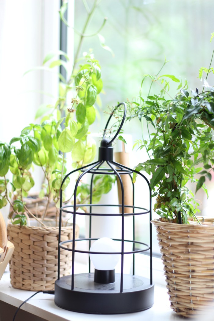 I moved the plant to this green corner on the windowsill. My little indoor garden! I absolutely love the way this looks with the pots made of natural materials and the lantern. Behind there you can also see our new watering can. I finally got around to replacing the old, mouldy plastic one with a beautiful steel and wood one which will hopefully last a long time.