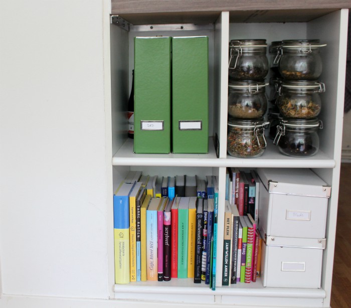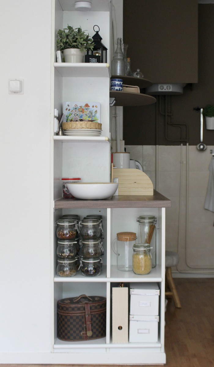 I’m so happy with this re-styling! It took very little effort, all I really needed was to see the light on where I wanted to go with the room and how to get there. The thing I love the most is the new look of the kitchen shelves, I can’t help but smile every time I look over there now. What a difference with before, when all I could do was think about ways to hide them! Now all there’s left to do in this room is to figure out a way to make the bookshelf look nicer. If you have any ideas, I’d love to hear! Just know that we’d like to keep these books on display, and I absolutely refuse to break up series, haha :)