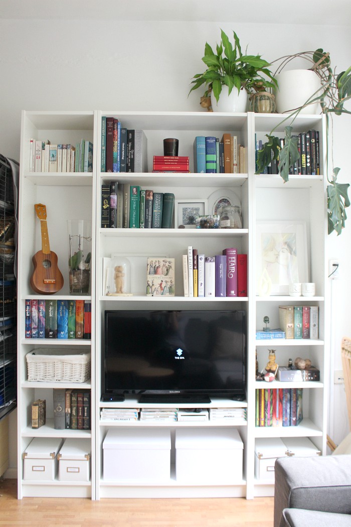 The first thing I did was to switch out the green boxes, which were slightly too wide anyway, for white ones. These are much more subtle and I feel like that helps a lot. I’ve also added another white box to the lower shelf on the right and removed the DVDs that were there, so that the bottom is now uniform and symmetrical. I’ve re-arranged the books in the center shelf so that there aren’t shelves made up of only books or only decorations, and to break up the lighter and darker coloured books. I’ve also laid a few books down horizontally, or propped them up face-forward, to provide a bit more variation.