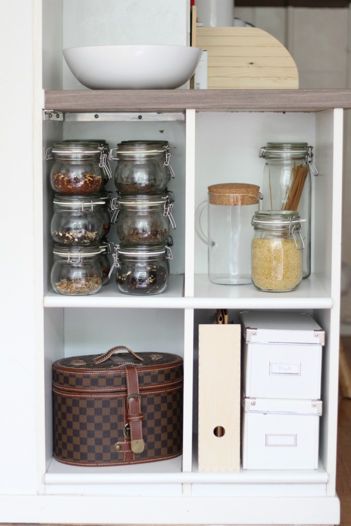 What a difference! I feel like removing all the brightly coloured books and the green magazine holders makes the space look much more mature and calm. I put the green magazine holders to use in various cabinets around the house, and replaced them with these wooden ones on display. Not only do these look nicer, they are much sturdier than the paper ones as well. The one shelf that only contains glass jars makes the shelf full of jars of tea beside it look more acceptable and in its place, in my opinion, where it just looked busy before. The new jars have found a function in holding dry goods so they’re not taking up space just to be pretty (although I certainly think they are). The checkered box, which holds my eyewear, is much better suited to this spot as well. I feel like it was too large and heavy to be on a top shelf, in my opinion the plant and lantern look much better there.