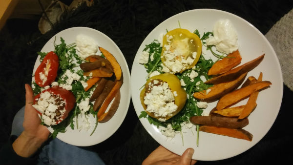 Sweet potato wedges and bell peppers stuffed with spicy lentils, sprinkled with the leftover cheese from the night before. This was delicious!