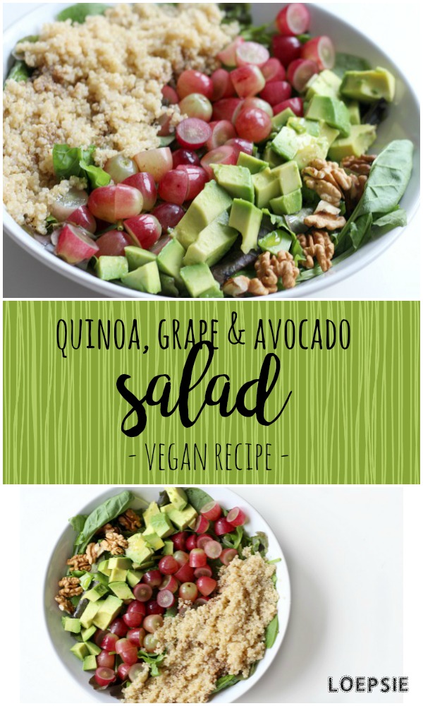 When you take a holiday in villages and small towns in central/eastern Europe, it’s not too surprising that you’ll have a hard time finding vegan dishes in restaurants. I’m glad to see more and more vegan options in the big cities every year though, and always very happy to try them. This summer, one night, we had dinner in a restaurant in Bratislava which had this dish on their menu: a salad with quinoa, grapes, avocado, pine nuts and aged balsamic vinegar. I ordered it and was very pleasantly surprised! It’s a really simple dish, but the flavours go so well together and the meal is packed with nutrients. I recreated it at home and wanted to share the recipe with you even though it’s super simple, as I think this makes a perfect lunch. I ended up using walnuts instead of pine nuts as the only pine nuts I could find were sold at €4,50 per 100g, and that’s just ridiculous. Walnuts work great in the recipe, so you can run with either, depending on what you have available!