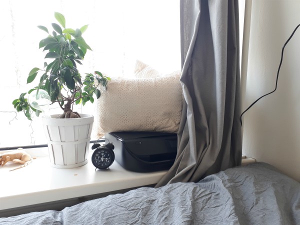 We ended up having to install it on the windowsill, and I tried to decorate it so that it wouldn’t be so obvious. I do think it looks alright there, even though it’s a bit of a strange place for a printer.