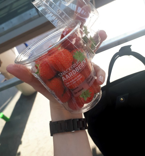 We were going to have dinner at her place, but our train got delayed by half an hour so I quickly grabbed some little strawberries to haul me over.