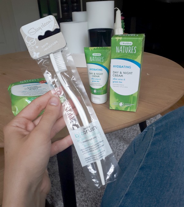 I got a new moisturizer from the new natural & vegan cosmetics line at Kruidvat, and while I was at it I got some makeup wipes from the same line and a toothbrush for travelling. I wanted to get an eco friendly toothbrush, and it took visiting three different stores before I found one. But here it is! A biodegradable toothbrush. Hopefully it lasts me a long time, as I only plan to use it while travelling.