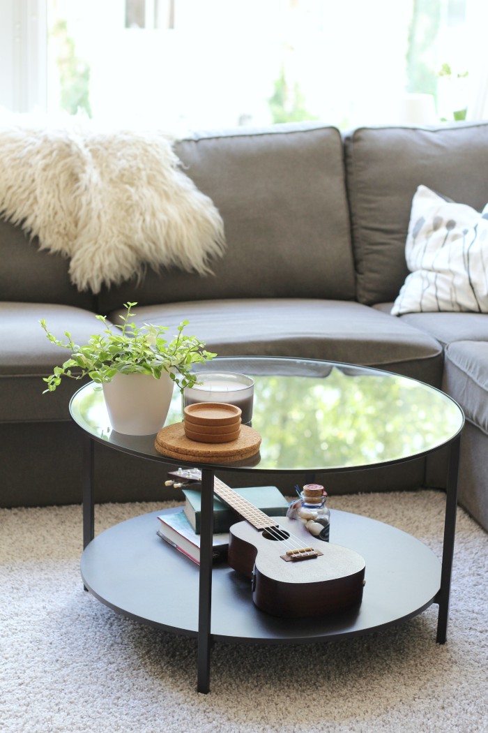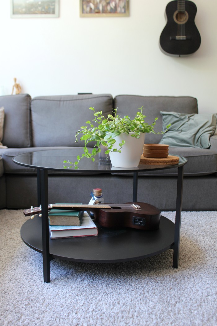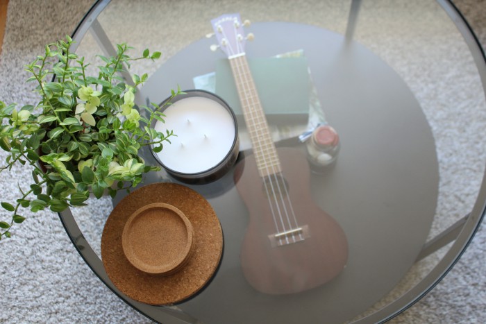 All the decorations look nice from all angles, they don’t compromise the functionality of the coffee table (in fact it’s been promoted to function as a ukelele stand as well), they work nicely together and they fit into the space perfectly. Knowing myself I’ll probably change everything up again before long, but for now I’m very happy with the way this looks.