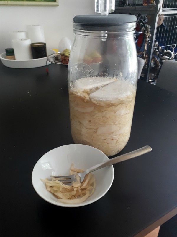 I pulled up my sauerkraut from storage again, and finally gave it a taste. It’s going so well! The taste is getting there, but I’m going to leave it to ferment for just one more week before transferring it to the fridge. I’m so happy it seems to have worked! Can’t wait to make my first kimchi too, when the sauerkraut is done.