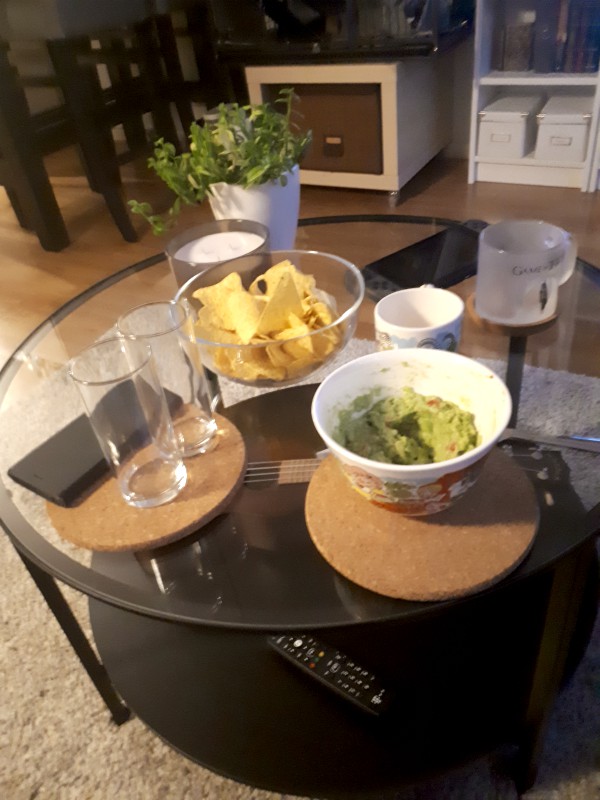 Tortilla chips and guac on our new, perfectly steady, coffee table. Yay!