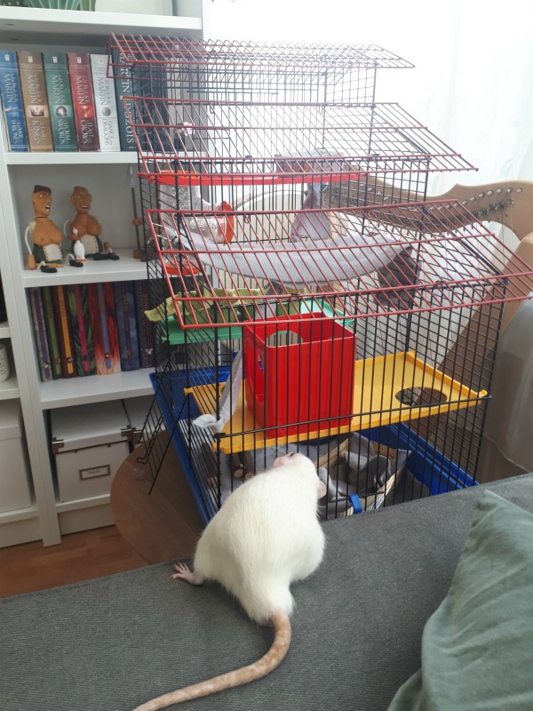 On Friday I got an email from the rattery asking whether I could come pick up the rittens a bit sooner, meaning this weekend. I was surprised as I wasn’t expecting them for a few more weeks, but the little ones grew really quickly as they had two moms nursing them so they were big enough to go to their new homes already. So I set up the little cage, and off we went on Sunday. This big brother to be was very interested in the little cage, haha!