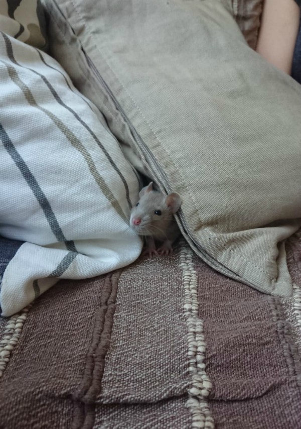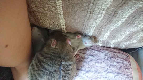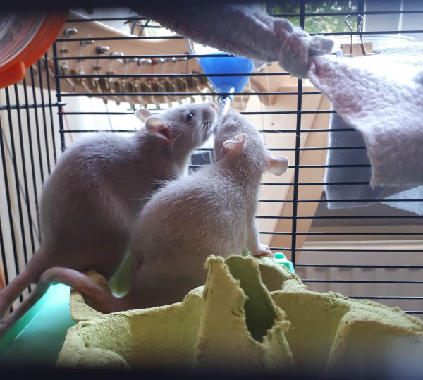When they came home we gave them a bit of time to explore their new cage, get settled, and rest for a few hours. Rittens always live in a separate, smaller cage for a few weeks after they get here, as the space between the bars on the large cage is big enough for them to fit through when they’re this small. We also want to be 100% sure they have a good relationship with the old rats before we put them all in a cage together, so they only meet under supervision for a while at first. Oh, and they get a different diet from the big boys, which is easier to maintain like this as well.