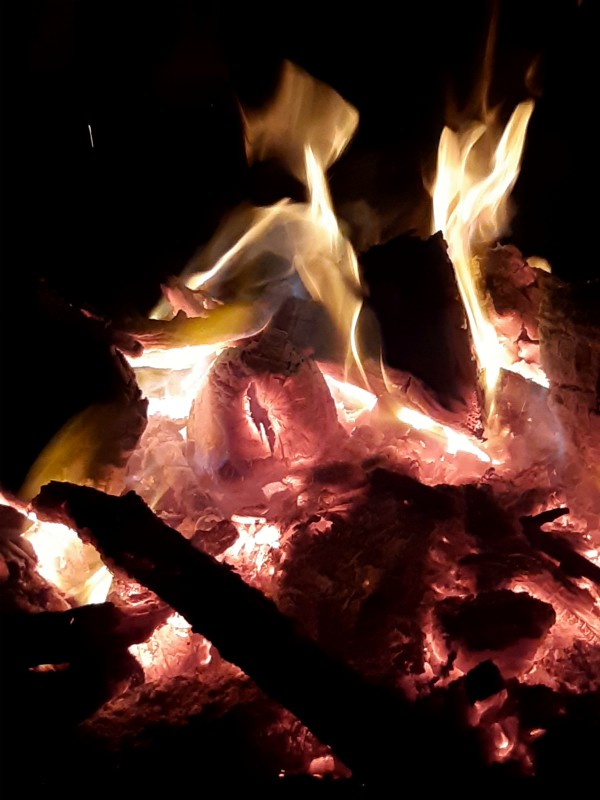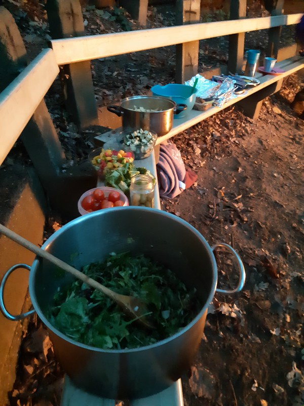 Campfire food: wrap a handful of finely chopped potato, veggies and/or meat in aluminium foil and place it next to the fire to cook for a few minutes.
